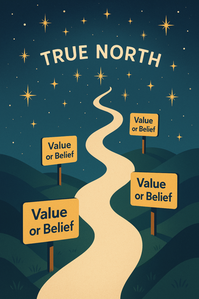 After discovering your True North, the next step is to anchor your future progress. This means identifying the values and beliefs that guide you along that path. Imagine a road lined with signposts—each one represents a value or belief that helps keep you on track.